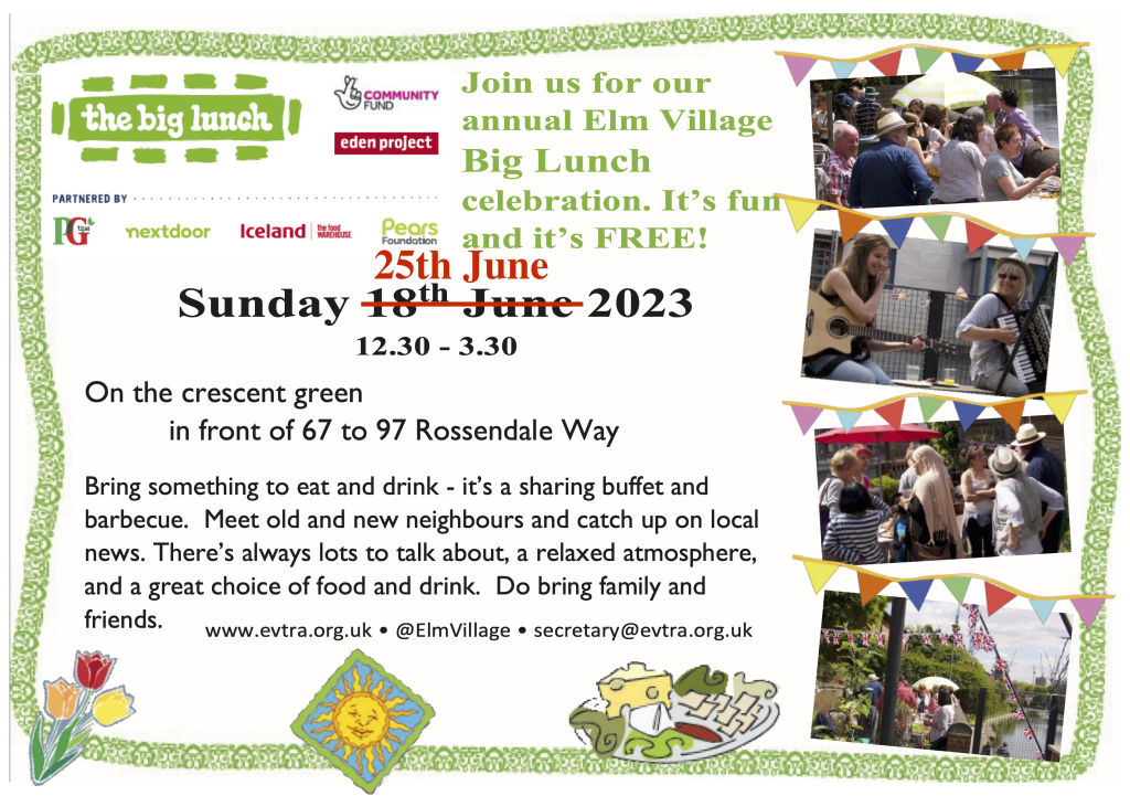 NEW DATE: Sunday 25th June 2023 12:30pm til 3:30pm: All welcome to our annual, ever-popular Big Lunch. Given busy lives, it’s a great time to meet neighbours in a relaxed environment. A chance to show your cooking or baking skills, if you wish, by bringing along your favourite dish. Bring drinks too if you like.