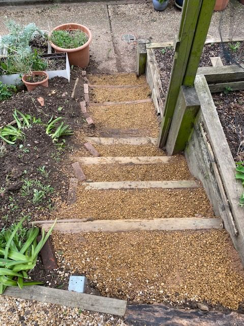 Steps linking the top tier with the bottom have been laid and made secure. The composting areas have been rearranged, as have the seating areas.