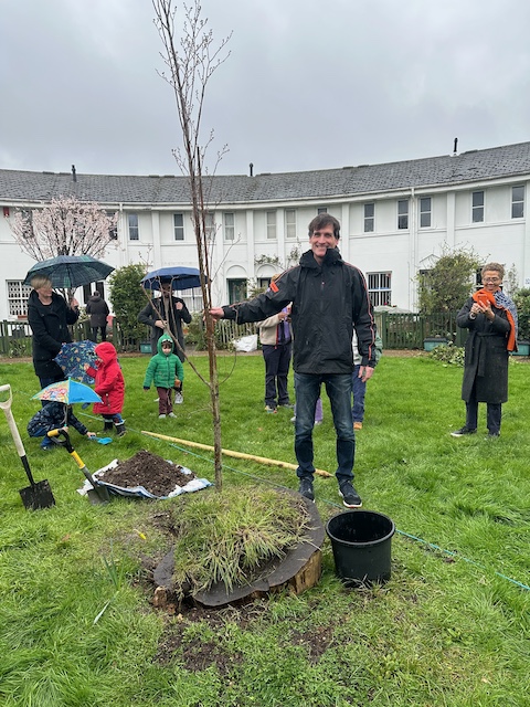 The new elm tree from the organisation called “Elms for London”, a charity supported by the Royal Parks and the Mayor for London, has been planted under a rainy sky with the help of a joyful crowd of young and less young residents.